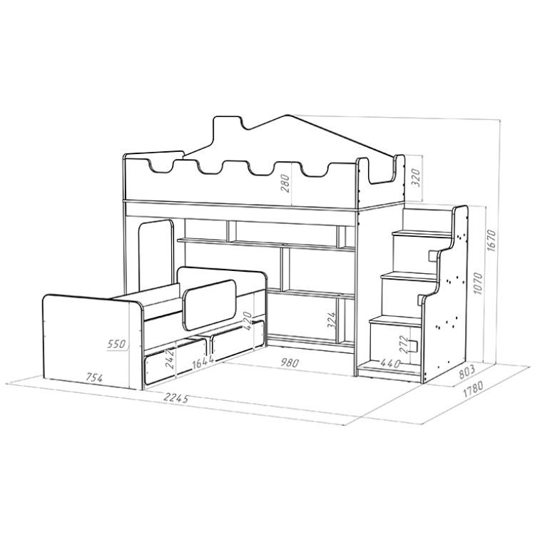 Под верхним ярусом кровати находится большой стеллаж, который предоставляет достаточно места для хранения книг, игрушек и других вещей. Угловая лестница с тремя дверками обеспечивает удобный и безопасный доступ на верхний ярус. На боках кровати имеются световые окна, которые обеспечивают естественное освещение и создают атмосферу уюта.